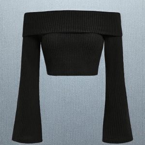 Midnight Ribbed Off-the-Shoulder Bardot Crop Top with Flare Sleeves
