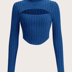 Women’s Royal Blue Mock Neck Cut-Out Top – Ribbed Long Sleeve Corset-Style Knit