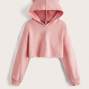 Pink Cat-Ear Cropped Pullover Hoodie