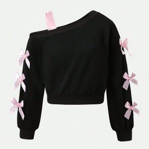 Off-the-Shoulder Bow Detail Cropped Sweatshirt – Midnight Black
