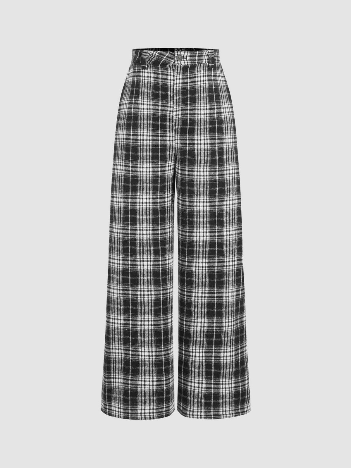 High-Waisted Plaid Wide-Leg Trousers – Black & White Tartan Straight Leg Pants