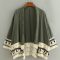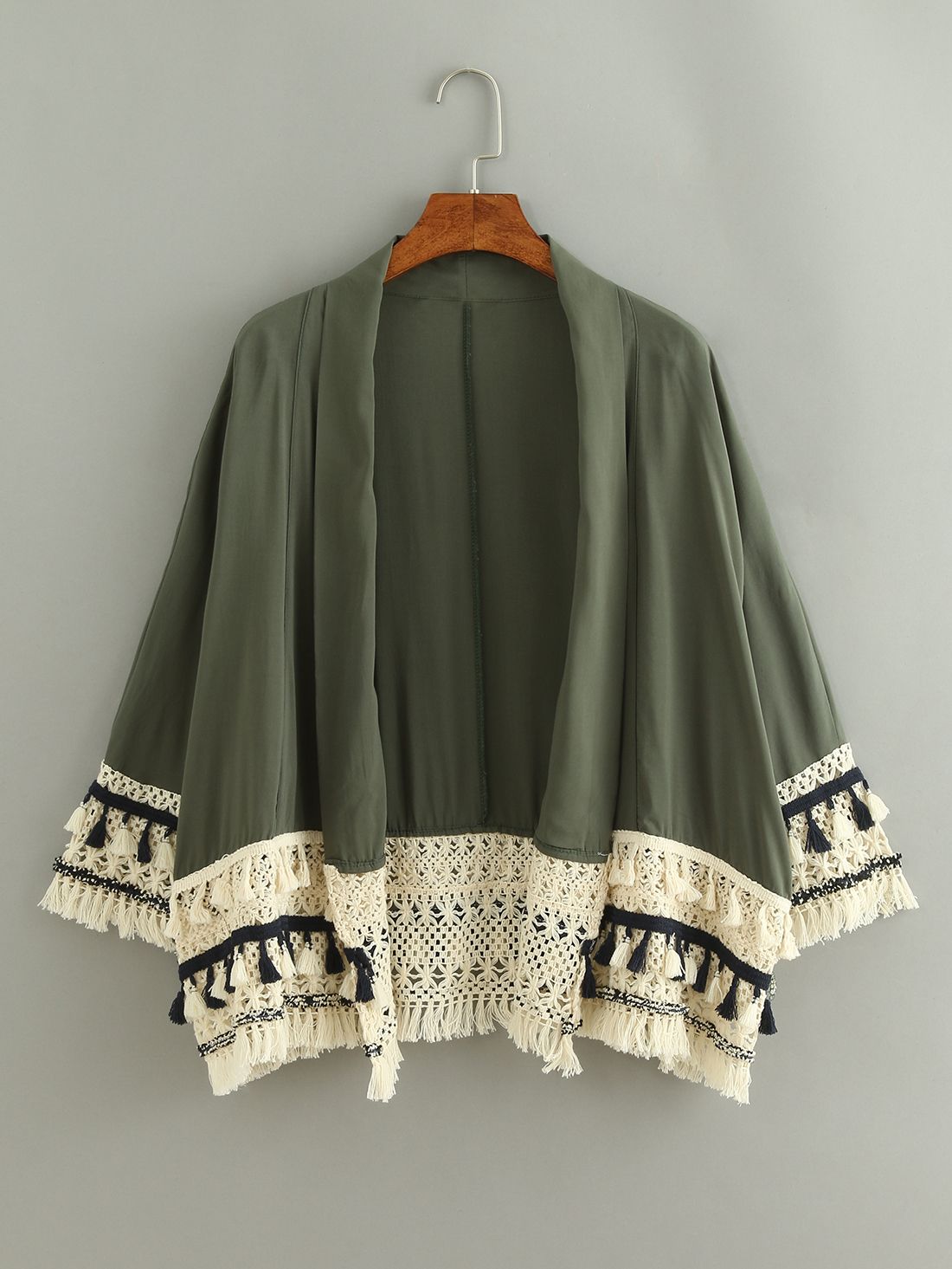 Elevate your layering game with the Olive Garden Crochet Trim Kimono Cardigan. This piece is a masterclass in bohemian detailing, combining a earthy olive green hue with highly textured cream crochet lace. The standout feature is the ornate fringe, which utilizes a mix of navy and cream tassels to create a sophisticated, handcrafted aesthetic that catches the eye with every movement.