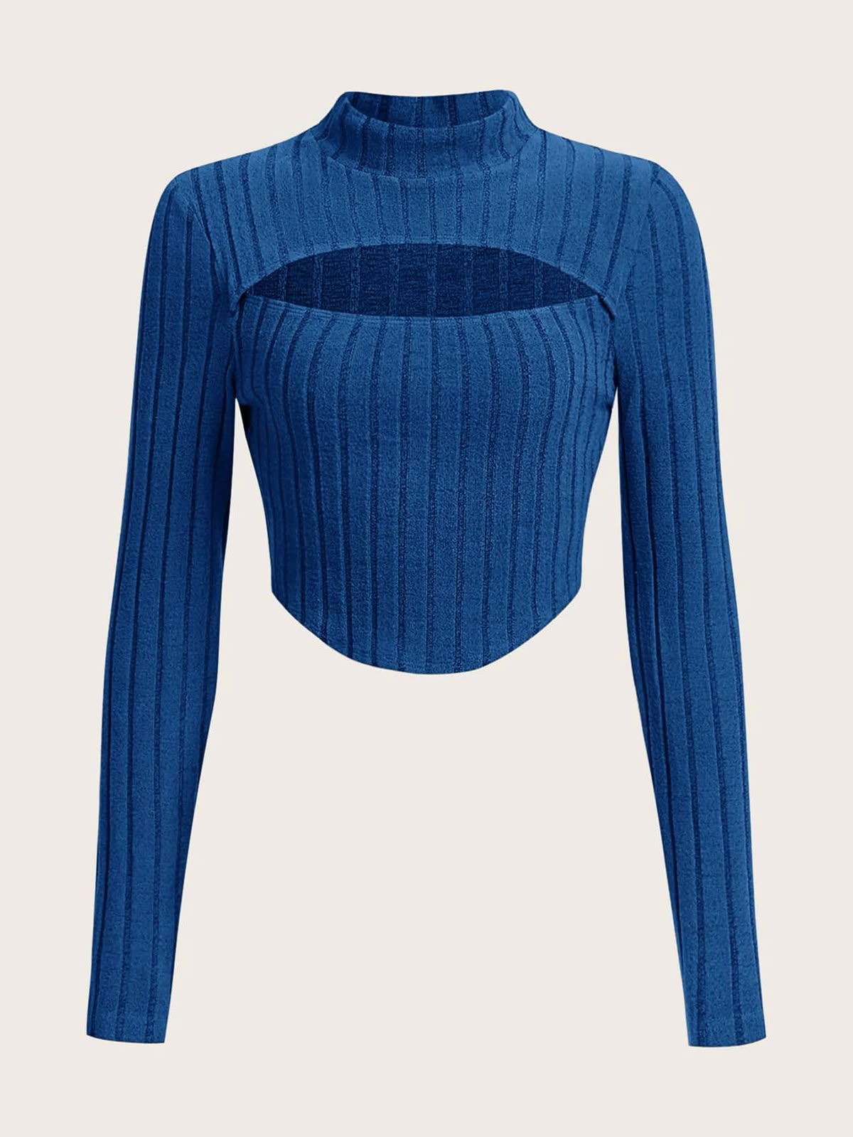 Women’s Royal Blue Mock Neck Cut-Out Top – Ribbed Long Sleeve Corset-Style Knit