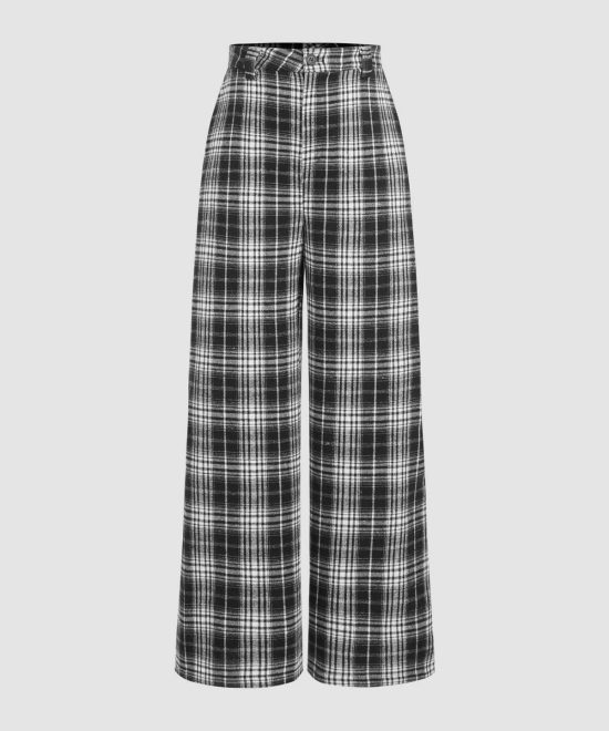 High-Waisted Plaid Wide-Leg Trousers – Black & White Tartan Straight Leg Pants
