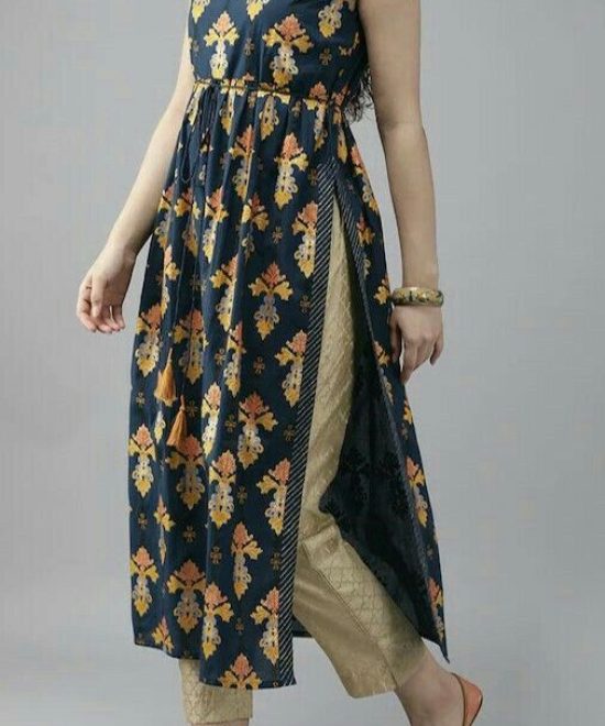 Navy Blue Ethnic Print Kurta – Sleeveless Side-Slit Longline Tunic