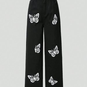 Aesthetic Butterfly Print Wide-Leg Jeans – Midnight Black