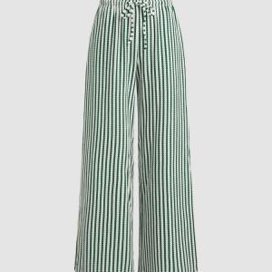 Women’s Green & White Vertical Striped Wide-Leg Trousers – High-Waisted Drawstring Palazzo Pants