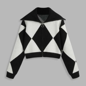 Harlequin Diamond Knit Cropped Zip-Up Cardigan