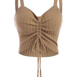 Women’s Chocolate Brown Twist-Front Camisole – Ruched Butterfly Hem Crop Top