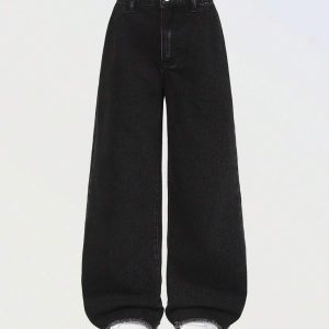 Women’s High-Waisted Wide-Leg Denim Jeans – Washed Black with Raw Hem